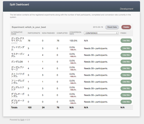 以下のように、あるモビルスーツの名称十個の中から、好きなモビルスーツの名称が出てきたら投票する、というものを百人のユーザを対象に行いました。