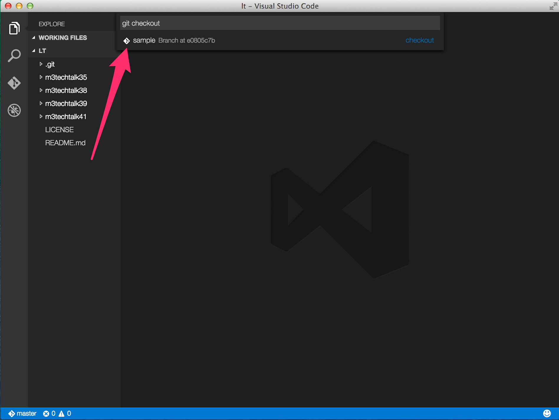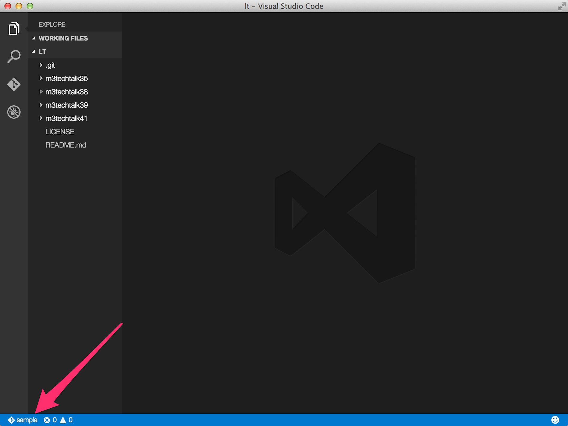 すると、Visual Studio Code 上部にウィンドウが表示されるので、変更したい branch 名をクリックします。今回は [sample] をクリックしています。