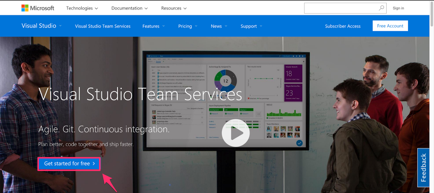 Agile, Git, CI | Visual Studio Team Services にアクセスし、[Get Started for Free] をクリックします。