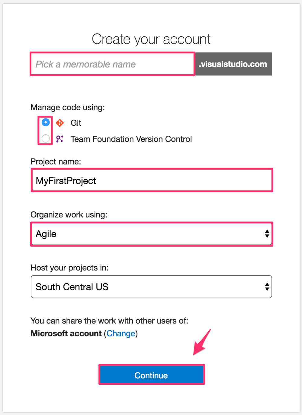 - Manage code using : 使いたい VCS(Version Control System) で、Git, Team Foundation Version Control から選択できます。