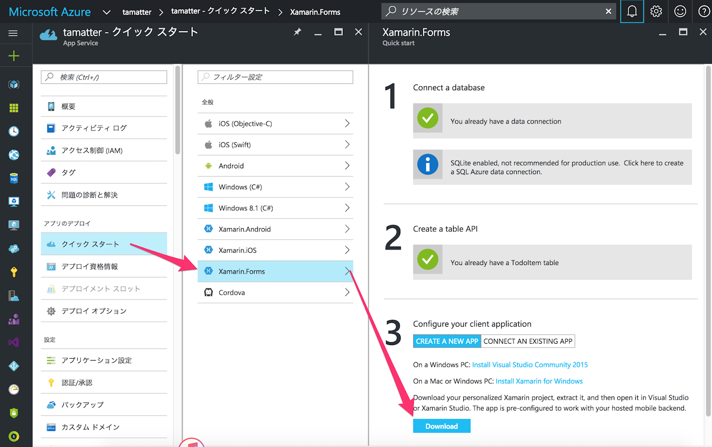 クイックスタートのため、[Connect a database] や [Create a table API] は何もしなくても自動的に準備してくれるので、楽ですね。 [Download] をクリックして、Xamarin.Forms アプリケーションをダウンロードします。ダウンロード後、ファイルを解凍します。